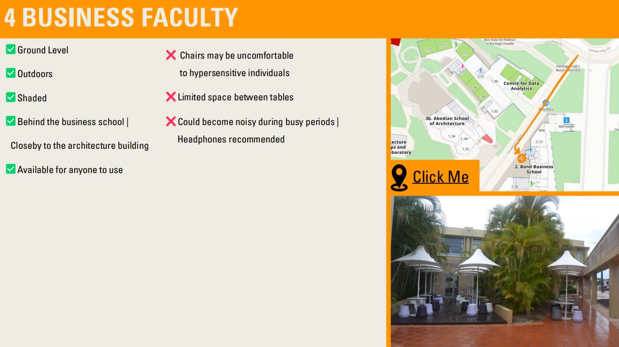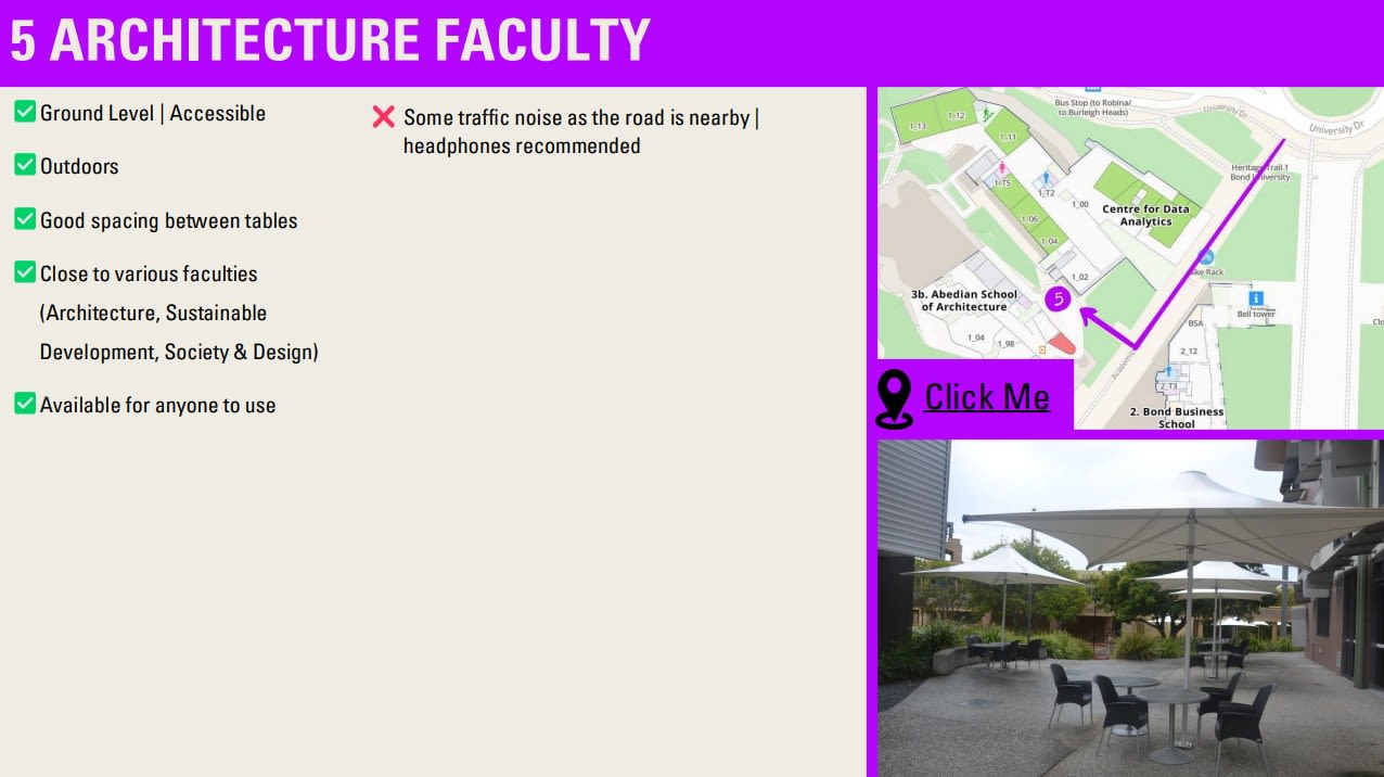 International student Neta Henkin was motivated by the prospect of making her peers feel more connected, and completed the subject feeling more connected herself. The Bachelor of Design in Architecture student worked on a digital campus map highlighting quiet spaces to study with sensory considerations.